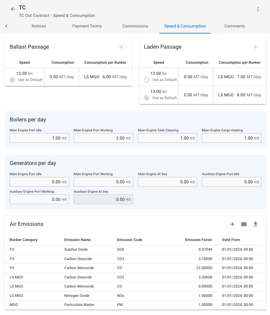 TC Contract inherits the vessel configuration and allows changing Boilers, Generators, and Air Emissions that will affect voyages linked to the chosen TC Contract. For further details on the significance and functions of Speed cards, Boilers, Generators, and Air Emissions in Dataloy VMS, please refer to the vessel Speed & Consumption page