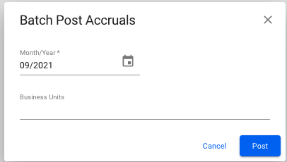 When you are in the Accruals page, and inside the Accruals tab, the Batch Post button is located on top of the top left corner of the table with the accruals. Click the button to batch post accruals and the modal below will appear on your screen.