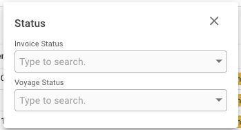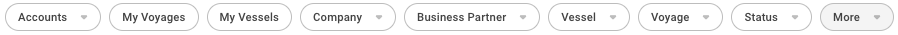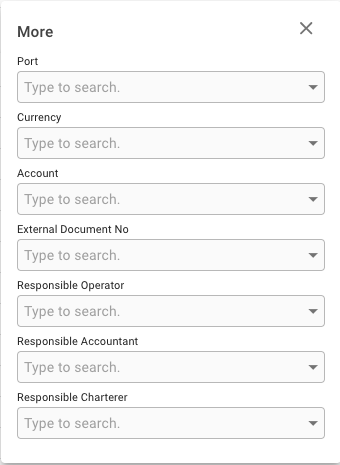 The Status filter allows you to filter on both Voyage and Invoice Status. By clicking on the More-filter, options for Port, Currency, Account, External Document No, Responsible Operator, Responsible Accountant, and Responsible Charterer can be selected.