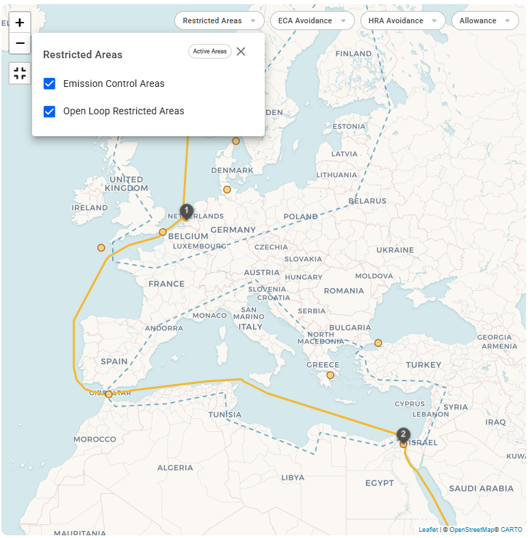 From release 8.6, optional Start Date and End Dates have been added to restricted areas. This ensures that when planning a voyage, you have a clear overview of which zones are active and how they impact fuel consumption and compliance requirements.