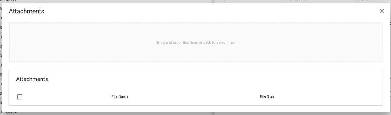 Once the attachments is clicked in the drop-down menu this modal will appear and you can drag and drop into the grey area, or simply click the grey area to browse your computer for files to add as attachments