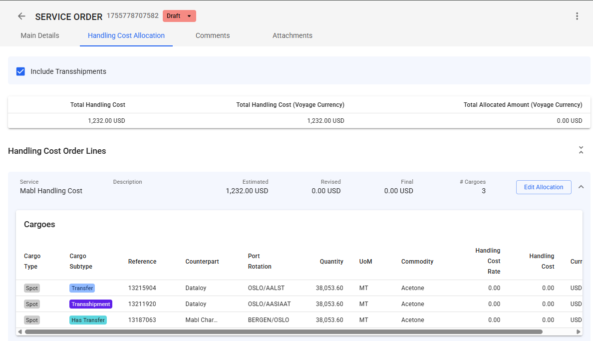 • A list of all cargoes allocated to this handling cost order line
