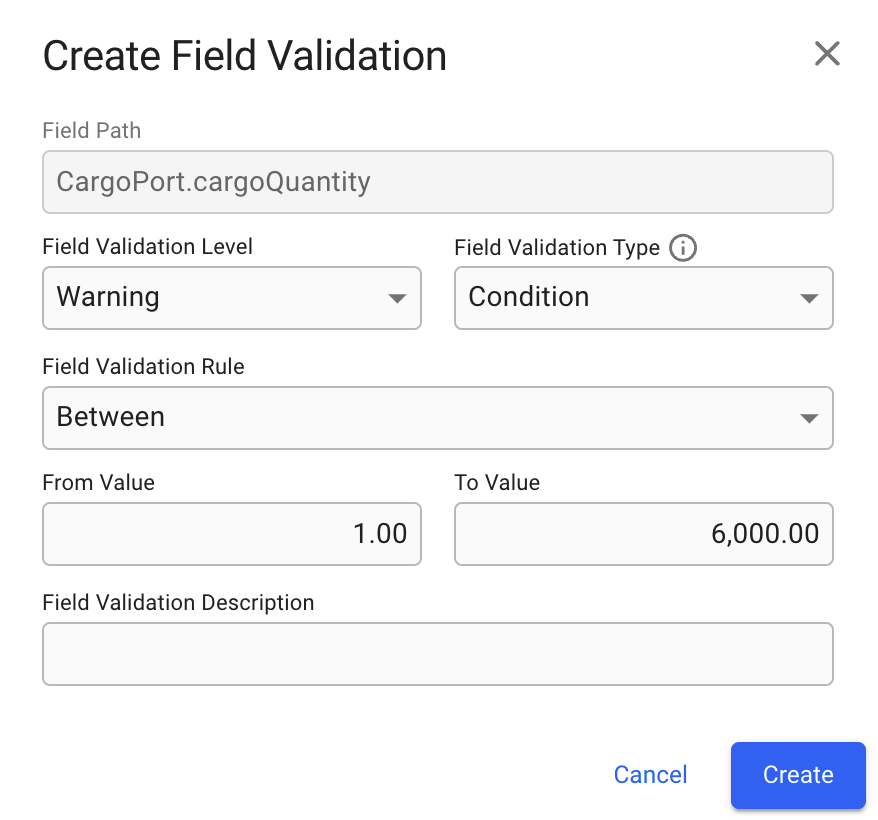 1.00as the From Value and6,000.00as the To Value.Add an optional description like: “Cargo quantity must be between 1 and 6,000.”