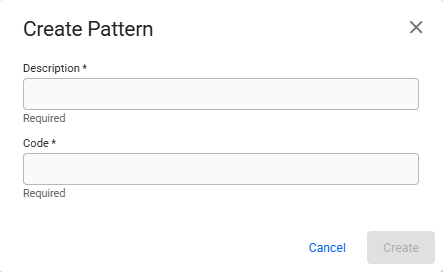 The Patterns list contains all the Patterns for selected Trade. You can create a new pattern by clicking the in the top right corner of the list. Clicking this will open the Create Pattern modal, as seen below. Both fields in the modal are required for being able to create a Pattern. The Code field also needs a unique code, that has not been used by any other pattern in your system.