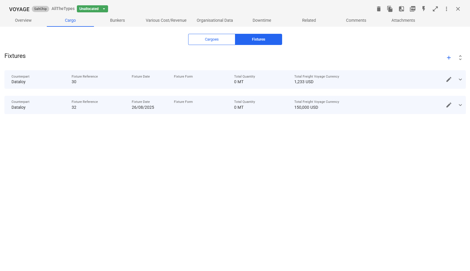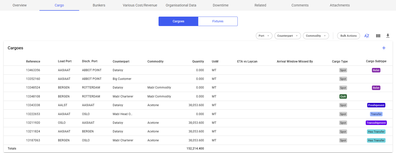 This tab shows a list of the cargoes and fixtures on the voyage.