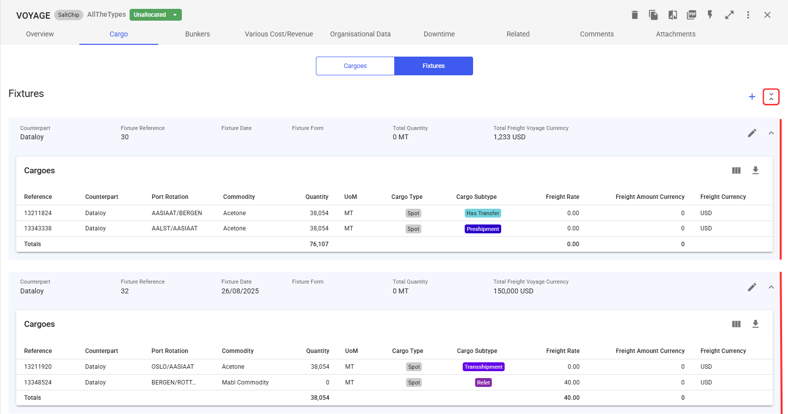The fixtures list has a separate button to collapse/expand the cargo list of all the fixtures with one click as shown below: