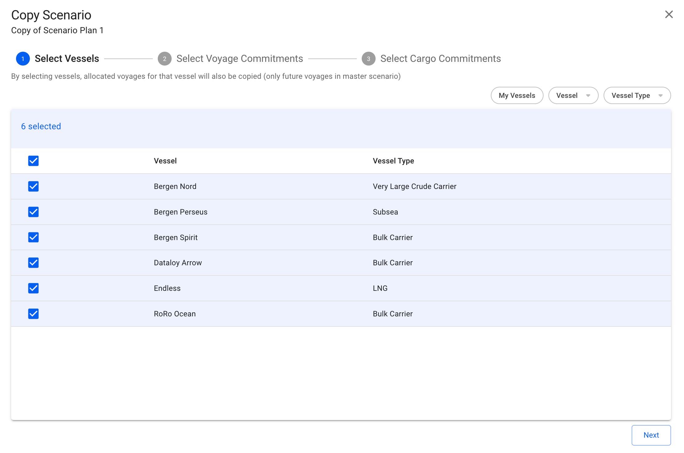 Then, a 3-stepper modal will show up and give you access to define what vessels, voyages and cargoes of that specific scenario you want to copy over to the "new" scenario. Firstly, you will be given the option to choose a name for the copied scenario: