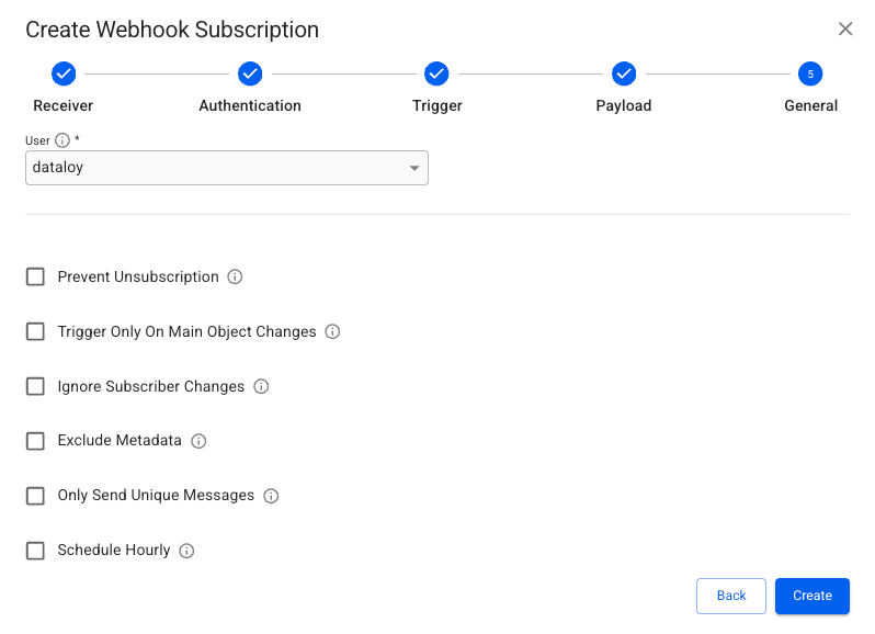 Below are illustrations and detailed descriptions of the fields required to create a new Webhook Subscription for each type.