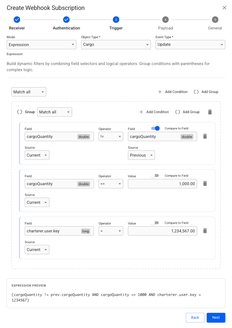 The Trigger specifies the condition that must be met to send a notification to the Receiver. Below are examples of various Webhook Subscription types, ranging from simple to more complex Trigger conditions.