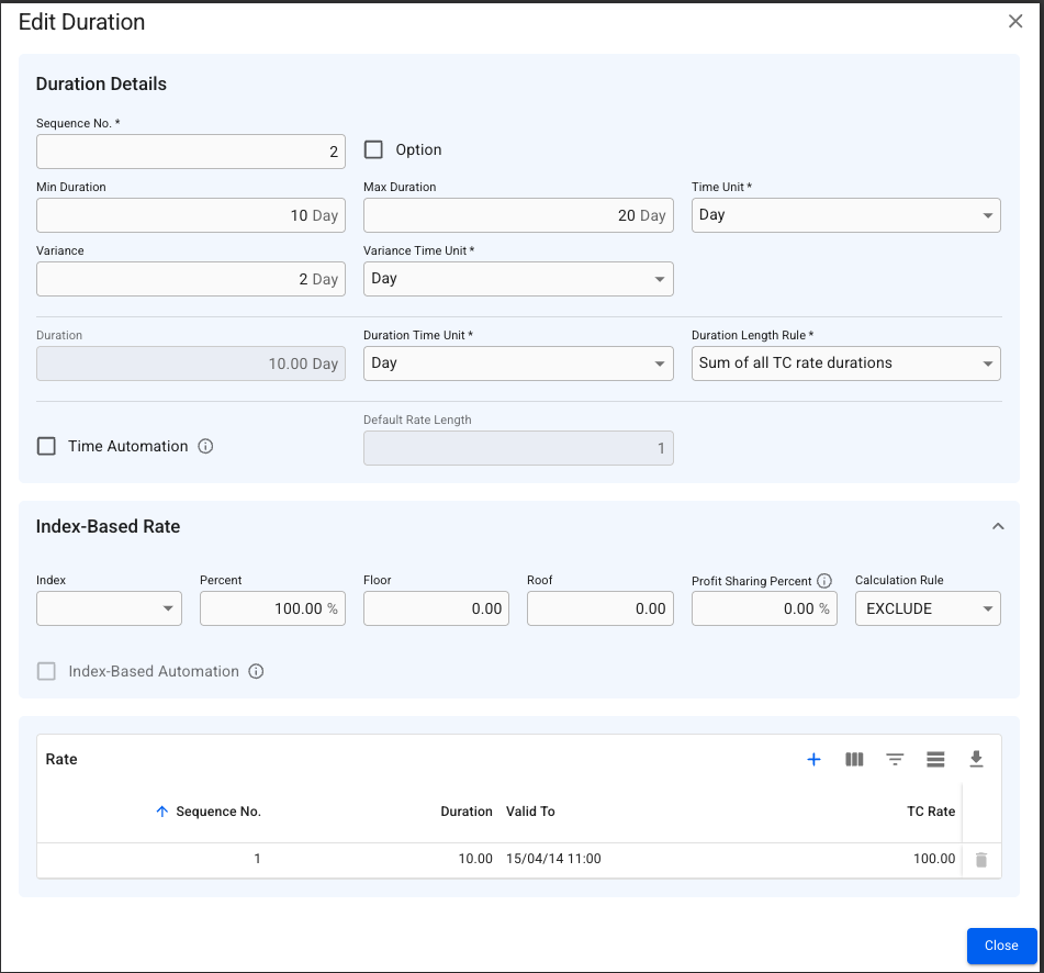 E.g., take the below example; if time automation is enabled, the duration length rule will become Maximum Duration + Variance*, which is here 20 days + 2 days = 22 days under duration. Since default rate length is now enabled, we can now override the defaulted 22 days, to e.g. 10 days: