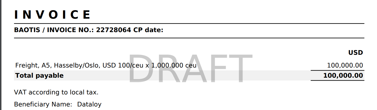 If you don't have the EU Tax Automation property set up (see the warning below), your invoice does not have any document line for the account Freight, or your issuing company is not in the EU (aka you don't meet any of the previous criteria), then the printout will look like before: