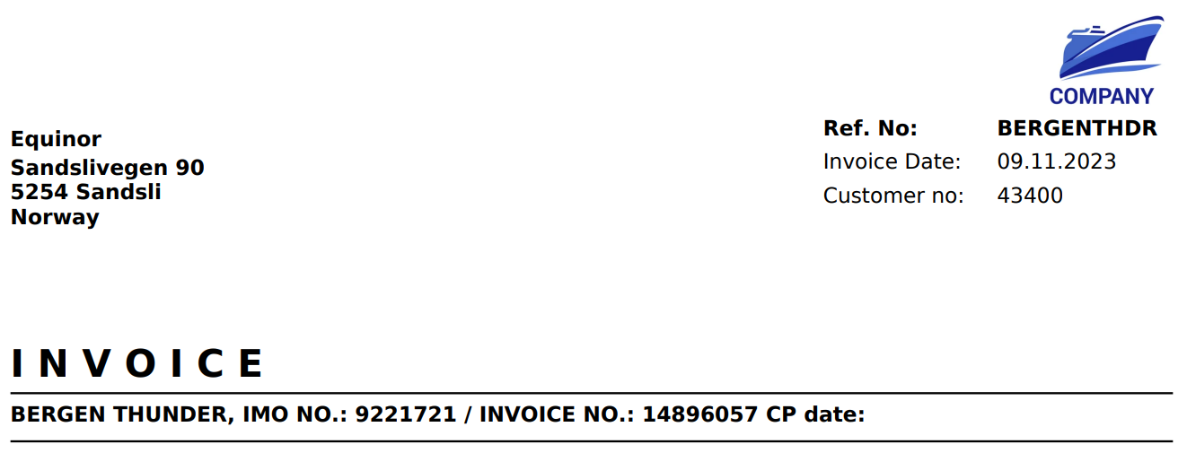 Shows the charterers VAT number underneath the payment details.