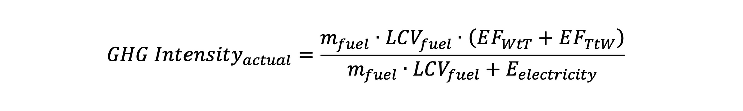 CB=((GHGIntensitytargetGHGIntensityactual)(mfuelLCVfuel+Eelectricity))CB = ((GHG Intensitytarget - GHGIntensityactual)*(mfuel * LCVfuel+Eelectricity))