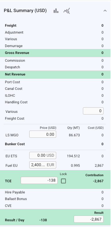 Compliance penalty can be seen in P&L section. Penalty price is adjustable per voyage, and is always on EUR. As mentioned, the default penalty price is defined on the System Settings. During the calculation of voyage results, the penalty is converted to the voyage's currency.
