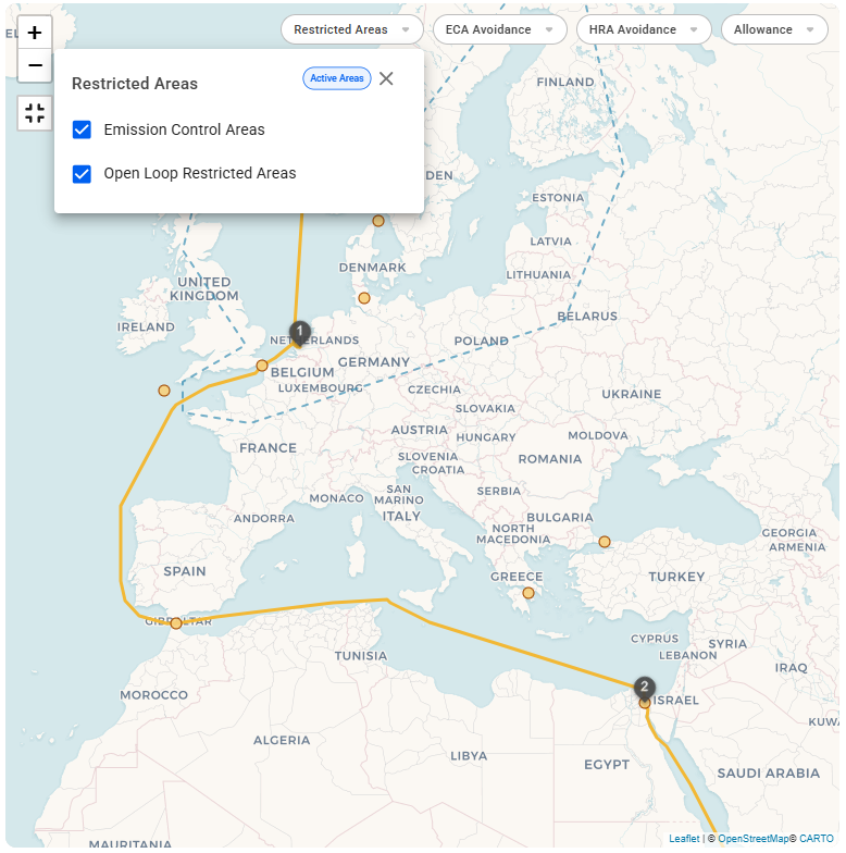 From release 8.6, optional Start Date and End Dates have been added to restricted areas. This ensures that when planning a voyage, you have a clear overview of which zones are active and how they impact fuel consumption and compliance requirements.