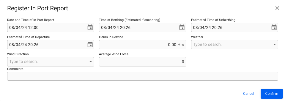 icon at the top of the drawer and select "Register In Port Report". A dialog will open and allow you to enter the details.