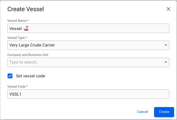 *The Vessel Code field is only visible and required if you have ticked off the "Set vessel code" checkbox. If the checkbox is not ticked off, a Vessel Code will automatically be generated for you.