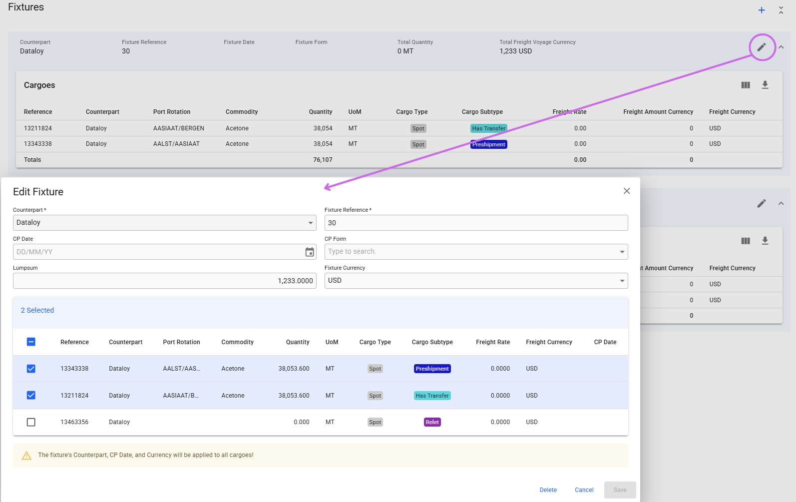 Clicking the Edit icon will open up the Edit Fixture modal, where you can change fields and select more or de-select cargoes.