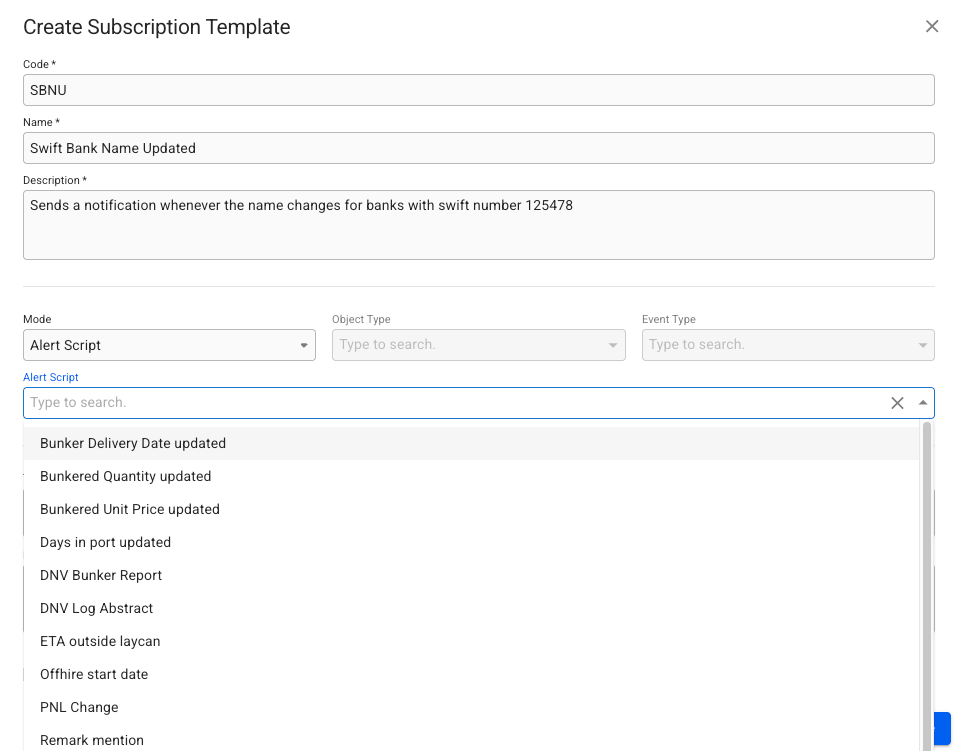 Below is an example of a Subscription Template with an Expression requiring a change of the field bankName and the swift address to equal a number for a notification to be sent. The expression builder allows building complex conditions to limit the amount of notifications to be informative and wanted. Its also possible to create a Subscription Template with an Alert Script as the trigger.