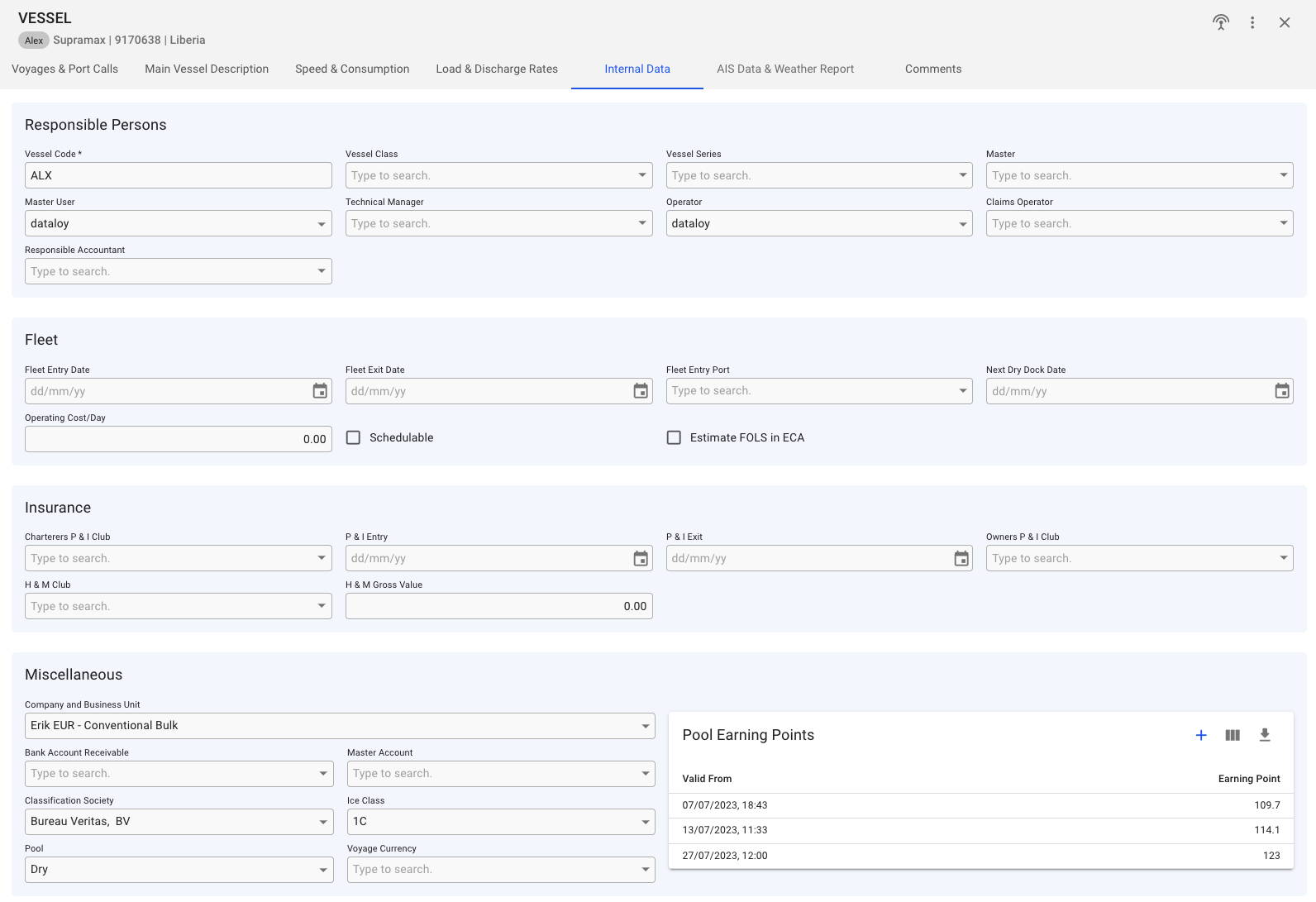 Here, you can set fields like [Company](https://docs.dataloy.com/release-8.2/voyage-management-system/step-by-step-guides/master-data/companies) and Business Unit, Bank Account Receivable, Master Account, Classification Society, specify the [Ice Class](https://docs.dataloy.com/release-8.2/voyage-management-system/step-by-step-guides/master-data/ice-class) (if classification society is selected), and Pool, as well as the *Pool Earning Points*. In this table, you can create, edit, and delete a Pool Earning Point: