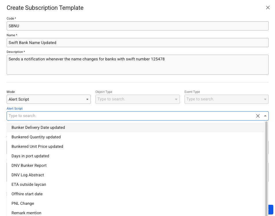 Below is an example of a Subscription Template with an Expression requiring a change of the field bankName and the swift address to equal a number for a notification to be sent. The expression builder allows building complex conditions to limit the amount of notifications to be informative and wanted. Its also possible to create a Subscription Template with an Alert Script as the trigger.