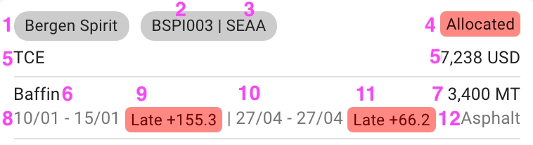 Each element in the board represents either a voyage (unallocated), a voyage with cargo(s) (allocated), a vessel, a vessel open position card or a last port call card.