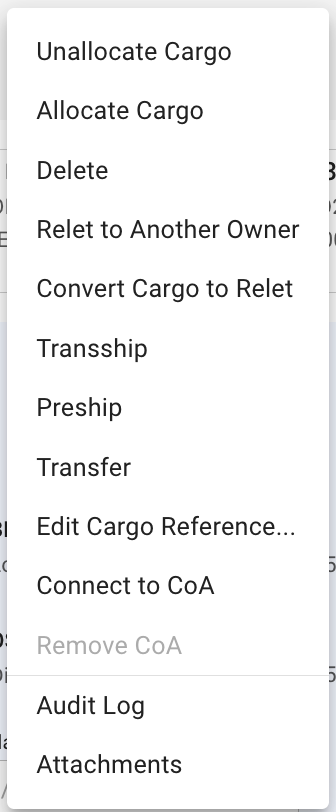 You can allocate/unallocate the cargo to move it to a voyage, change the voyage it is on or remove it from the current voyage.