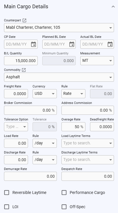 On the right side, below the Bunker Adjustment section, you can enter external reference, Trade, Cargo Text, Comment, Company, Business Unit and Cargo Operator: