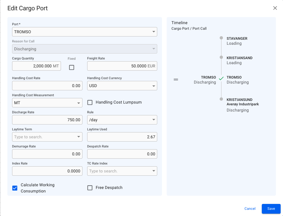 Below the KPI-cards on the right side is the Cargo Port Timeline together with LayCan dates. Laytime used is the estimated laytime allowed. The date fields are validated and if the validation fails the date field that needs to be corrected is highlighted in red and there is a short message under the date field indicating what is wrong.