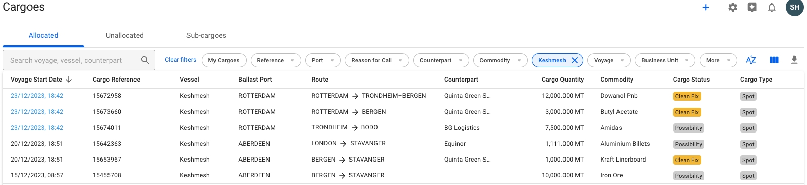 The Cargoes page is designed to be able to show the history of cargoes by setting filters and customising columns to your needs.