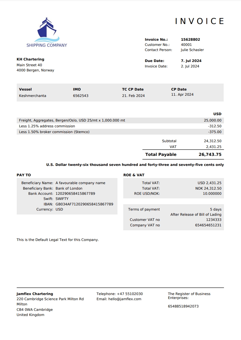 When printing a document related to a cargo Fixture, an appendix will be added to the invoice, detailing the cargos of the fixture. The list will show the port rotation, commodity, actual BL date, the gross weight of the cargo in metric tonnes, and any external references.