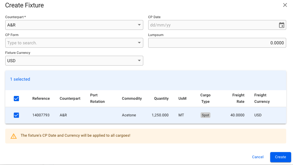 By clicking at the Create icon, you will be able to create a fixture containing cargoes of the same Counterpart.