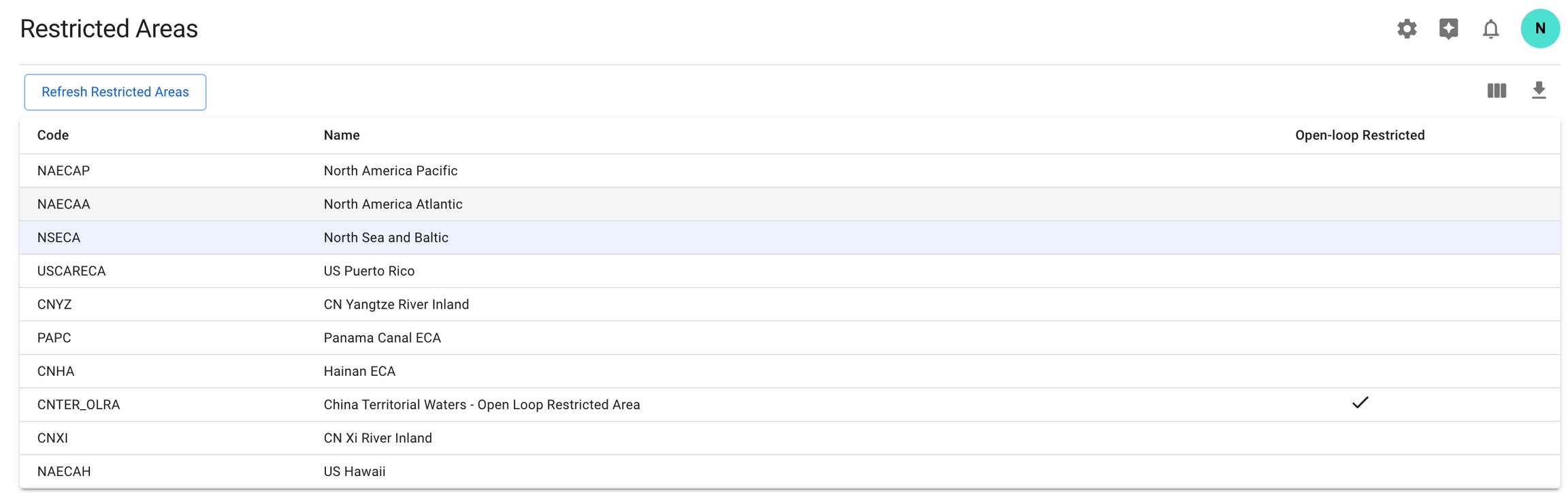 The Restricted Areas module provides an interface to manage and view zones with special regulations. Users can explore the list of restricted areas, detailed attributes, and allowed bunker categories. This feature is critical for ensuring compliance with environmental and operational standards in maritime regions.