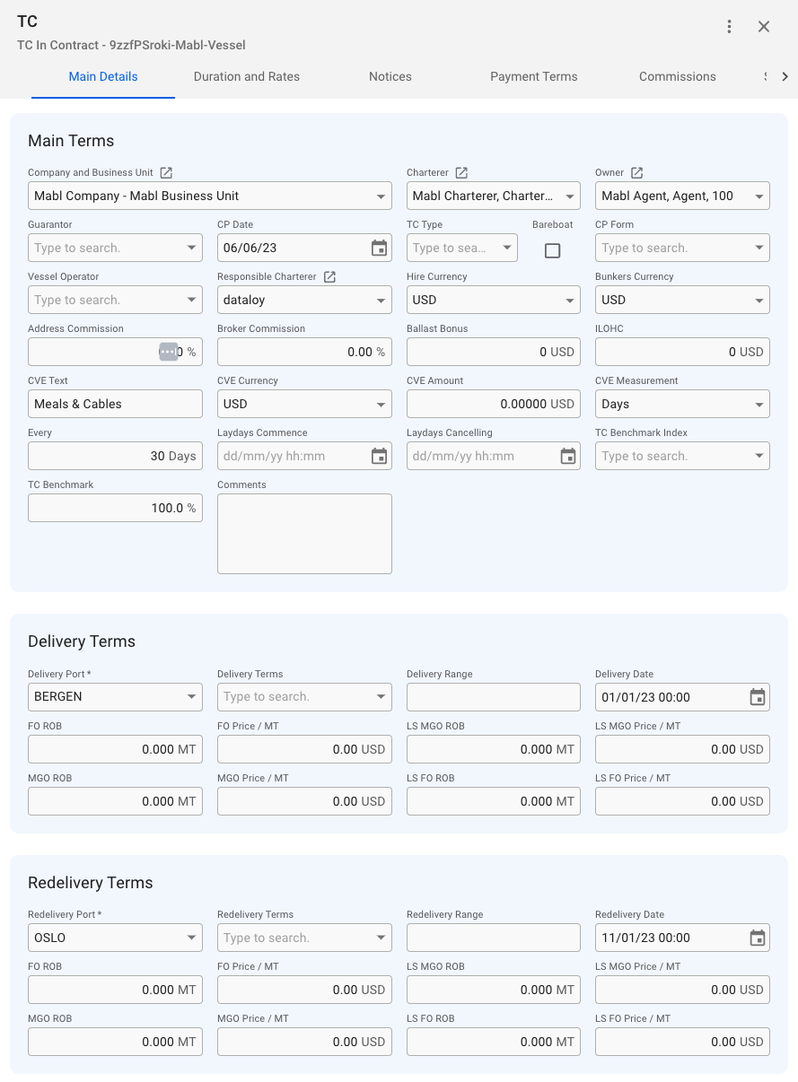 **The Main Details** tab that is shown by default when opening a Time Charter Contract has 3 sections where you can edit information on the **Time Charter Contract.**