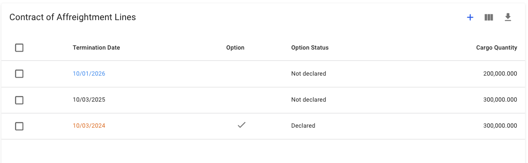 <figure><img src="https://content.gitbook.com/content/Tiyan8mQCJc6UrGHwouE/blobs/RutHtRCxLi7Omz6BUUWX/image.png" alt=""><figcaption><p>Contract of Affreightment Lines Table</p></figcaption></figure>
