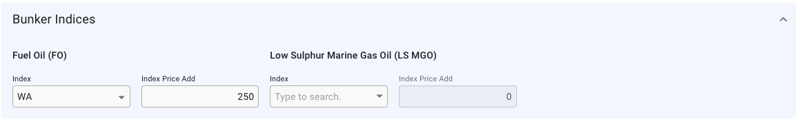 1. Bunker Indices: this section helps to have a better overview of bunker indices even when the fuel types FO and LS MGO are not consumed by a vessel. By default, the section is collapsed, providing information regarding the bunker indices. Once expanded, the indices can be altered. Refer to Figure 1 for example: