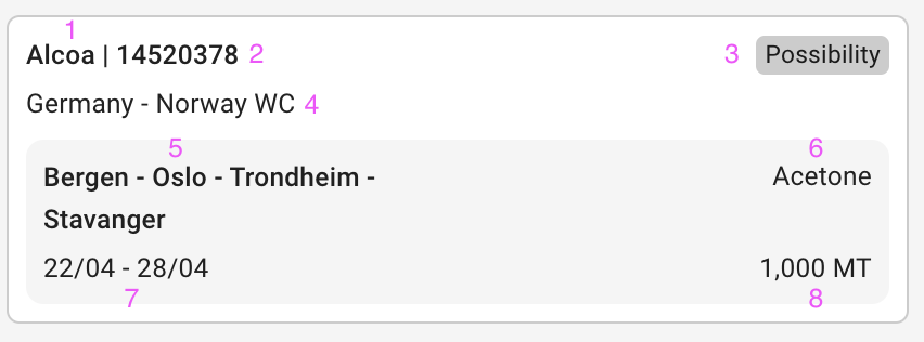 By hovering over a cargo card or on a *port call row*, a tooltip can be viewed. Fields in the tooltip that contain no data are hidden: