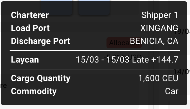 By hovering over a cargo card or on a port call row, a tooltip can be viewed. Fields in the tooltip that contain no data are hidden: