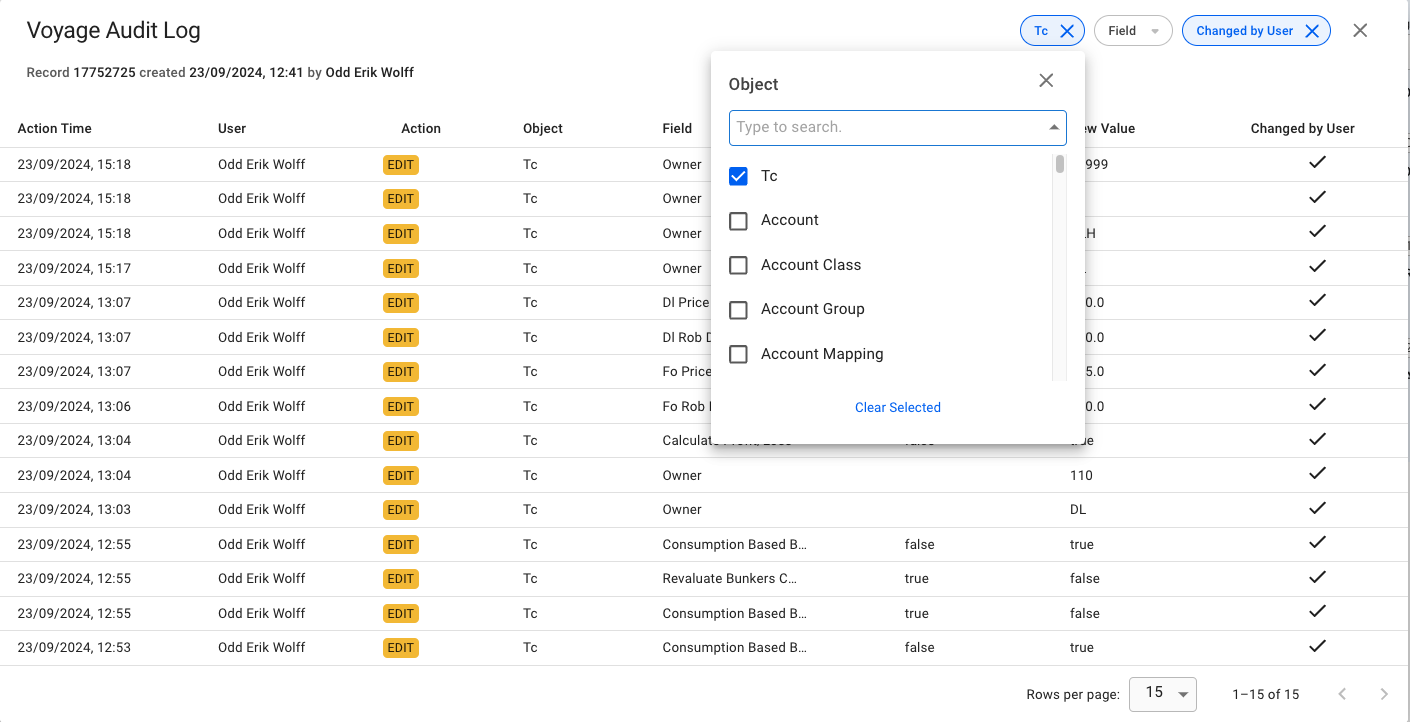 It is possible to narrow down the audit log by Object and by Fields.