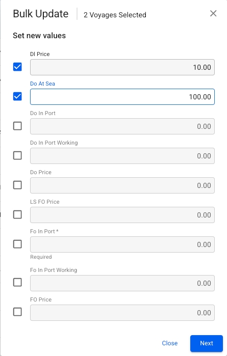 Bulk Update lets you modify specific fields across multiple rows (voyages, items, etc.) at once, saving time and reducing repetitive actions. Each list will show different fields for bulk updating. If no bulk-editable fields are configured for a particular list, an empty Bulk Update window will appear.