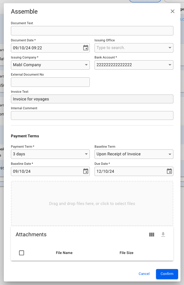 An assemble modal will open and some of the fields will be pre-filled. Make sure all mandatory fields (marked with *) are entered and click Confirm. The assembled invoice will open in a drawer.