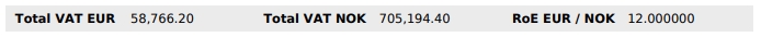 If your document currency is a different currency than the currency associated with the VAT country, then the PDF printout will automatically contain a section with the Rate of Exchange and the VAT in both currencies (this will happen, independent of if you are using the old invoice template or the new one).