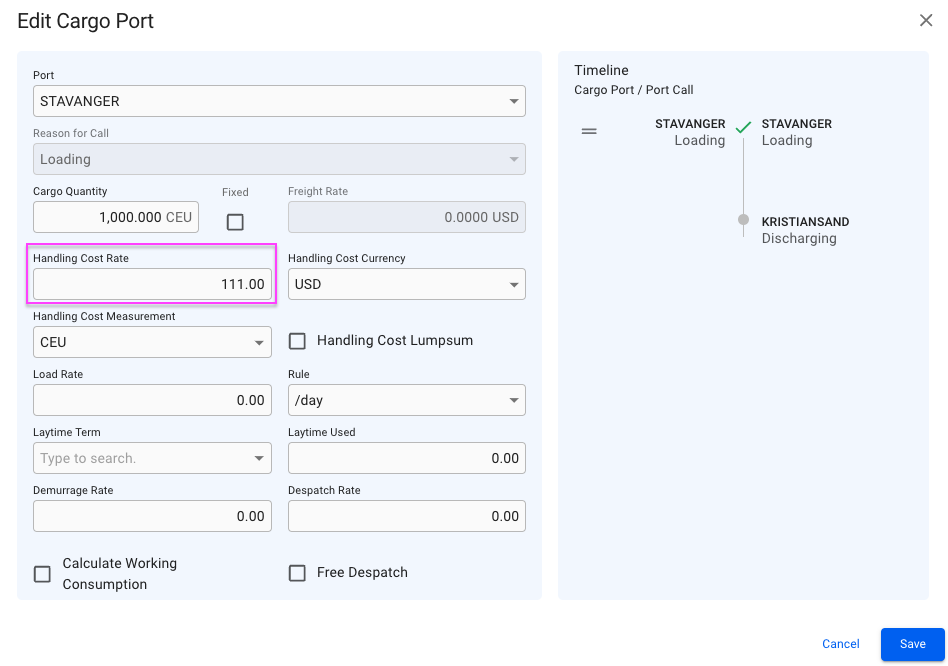 By default, the 'Use Handling Cost from Service Orders' checkbox is set to **false**. It will at the **false** state retrieve the value set in the 'Handling Cost Rate' field of the Stavanger Cargo Port, which you can set manually inside of the Edit Cargo Port modal: