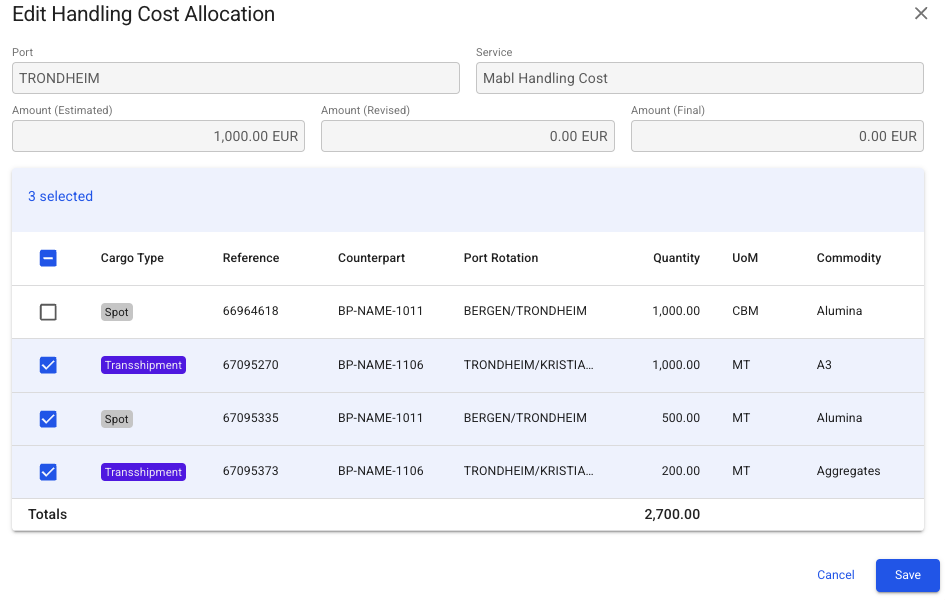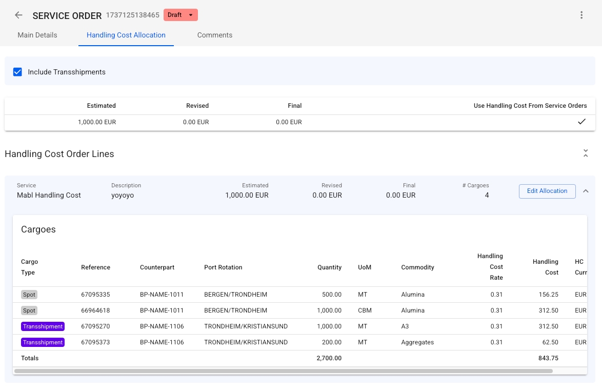 This is available from the HCA tab, at the top. Whenever you have transshipment cargoes on this specific port call, and you decide to include them in the HCA proration, you are then able to allocate/unallocate the transshipment cargoes as well, from the Edit Allocate modal view.