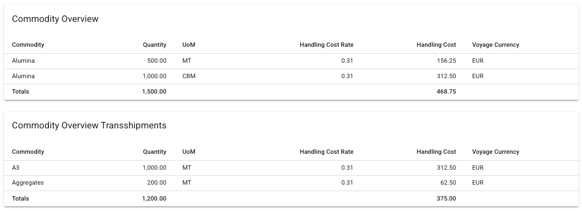 View non-transshipments and transshipments Commodity Overview table, displaying e.g. the aggregated amounts of Handling Cost, Quantity, etc. (click to open in full):