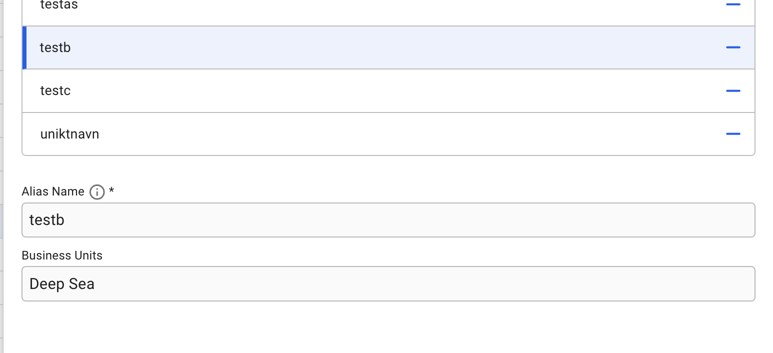 Once an Alias is created you will be able to assign Business Units to it using the drop down menu for each Alias when you click on the "Business Unit" input field.\