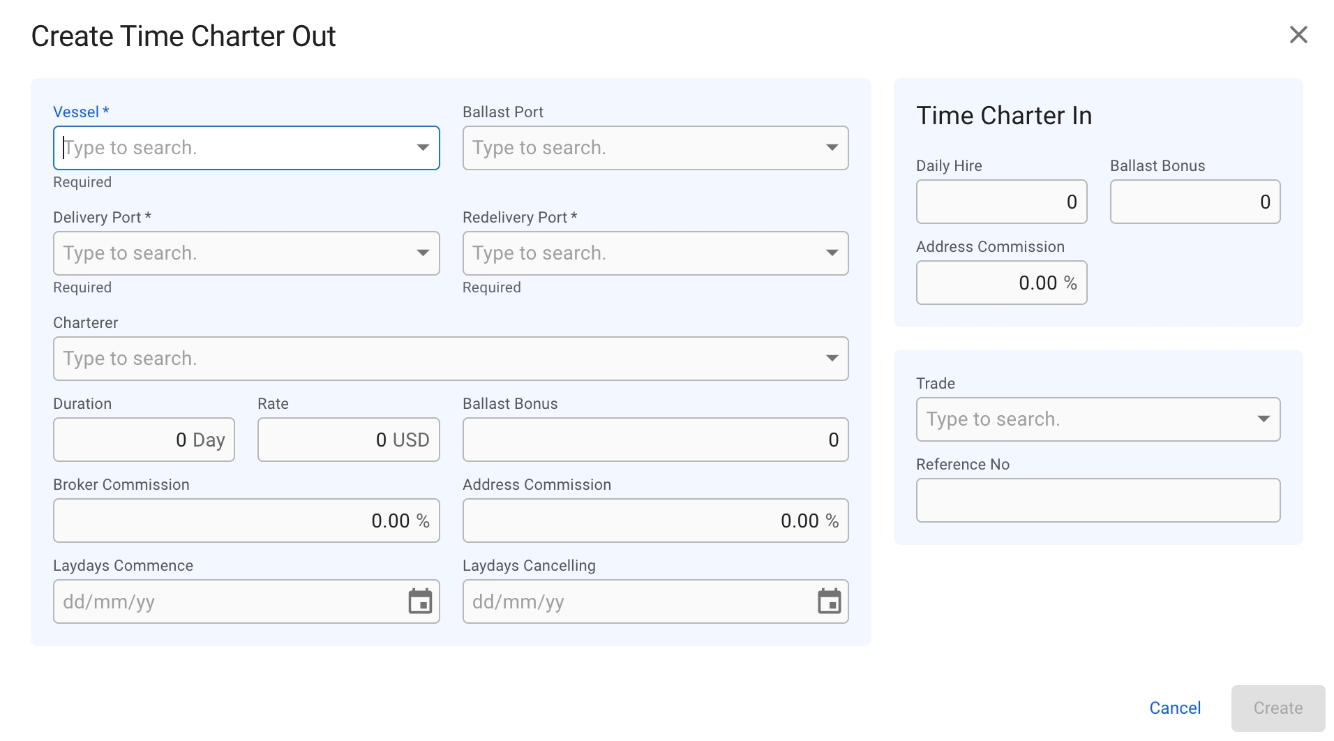 In the modal, you can fill in the required fields and add any additional information about the new TC voyage.