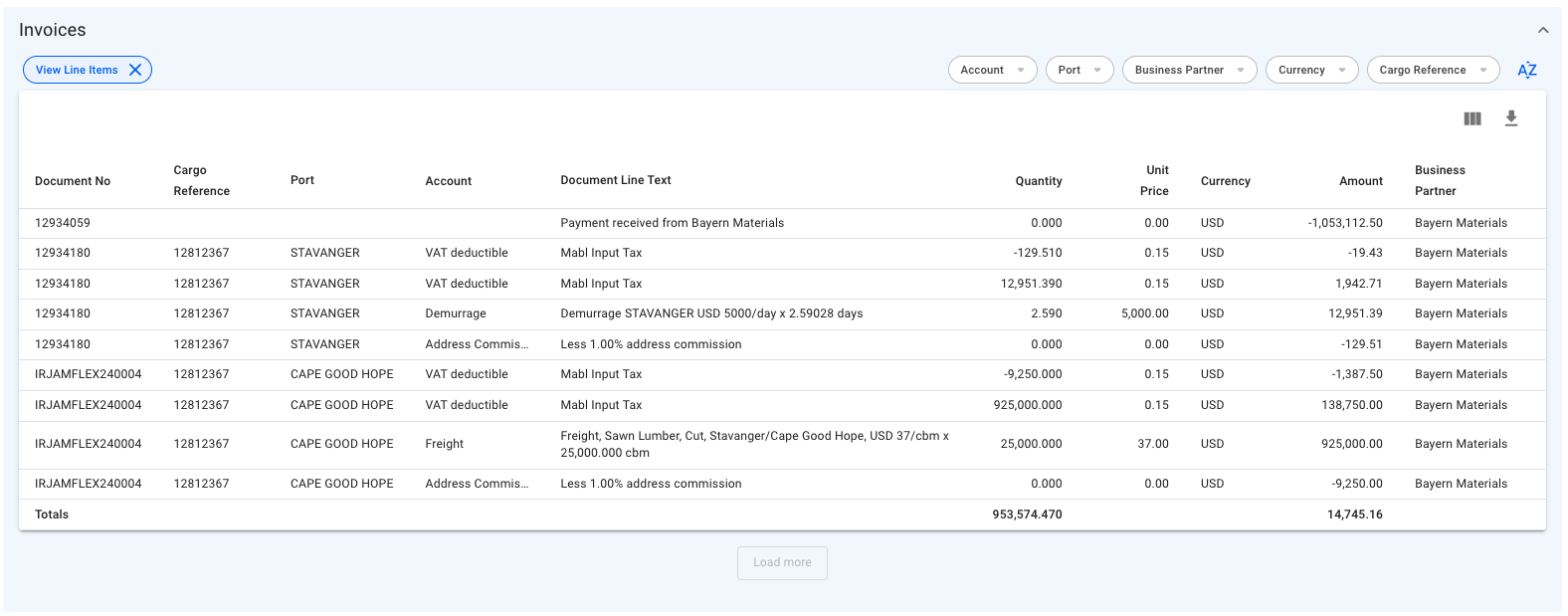 <figure><img src="https://content.gitbook.com/content/JhyVcvJBzVdJKycXnSTF/blobs/MtS82uoV6jSI8SBbLFjz/Skjermbilde%202024-02-26%20kl.%2009.20.05.png" alt=""><figcaption><p><em>The invoicing list of the voyage, displaying the document lines for the invoices.</em></p></figcaption></figure>