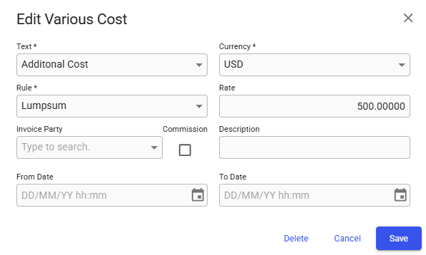 All **Various Cost/Revenue** entries are also displayed in the **Various Grid** (accessible in full-screen view), allowing you to easily view, edit, or delete entries as needed.