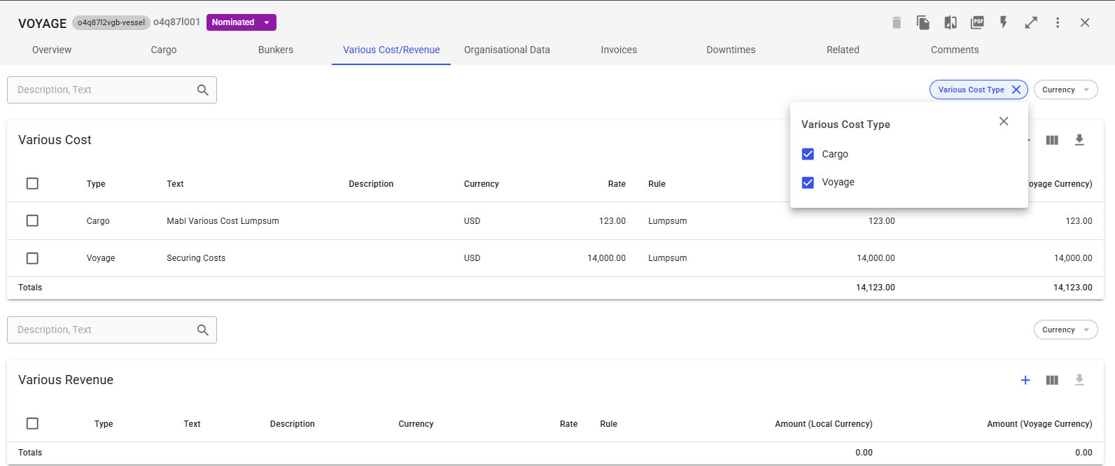 * **Voyage-Specific Filters** – If the voyage includes **Various Cost/Revenue** linked to **Cargoes** or **Off-hires**, a filter will appear in the top-right corner of the list. Use this filter to select which types of Various Cost/Revenue should be displayed.
